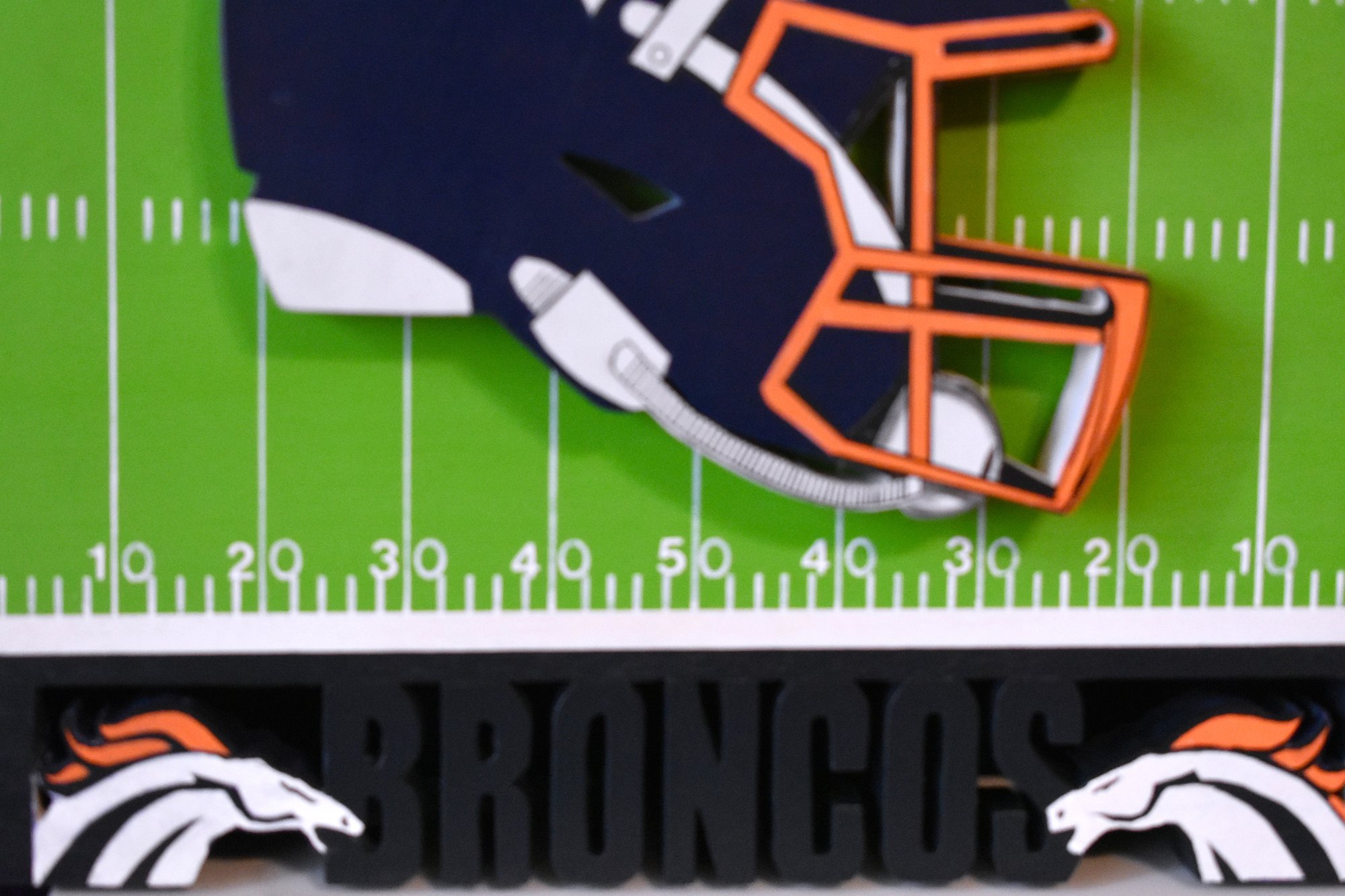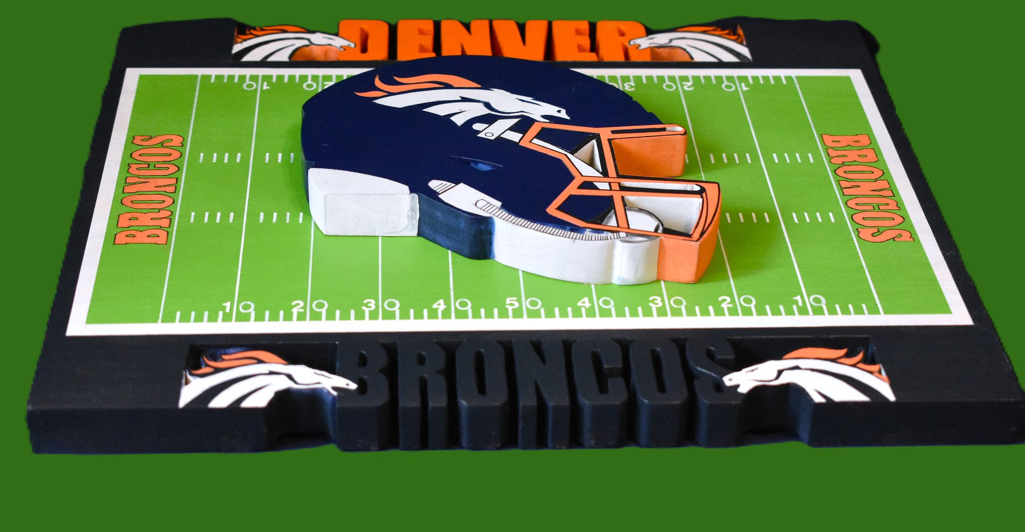 Show your team spirit with this Denver Broncos football field Decor, featuring the iconic Broncos helmet logo that every fan will recognize. Crafted from 100% Poplar Board Wood, each piece is meticulously hand-carved, and hand painted, ensuring a unique and high-quality finish that stands out in any setting. This durable sign measures thirteen inches in length and eleven ¼ inches in height, making it a perfect addition to your home or office décor. The sawtooth hanger on the back ensures easy installation, allowing you to proudly display your allegiance to the Broncos. Elevate your game day experience and celebrate your favorite team with this stylish and functional piece. This one-of-a-kind sign is not mass-produced, making it a distinctive addition to your space. For a closer look at its intricate detail. Please refer to the accompanying photos.