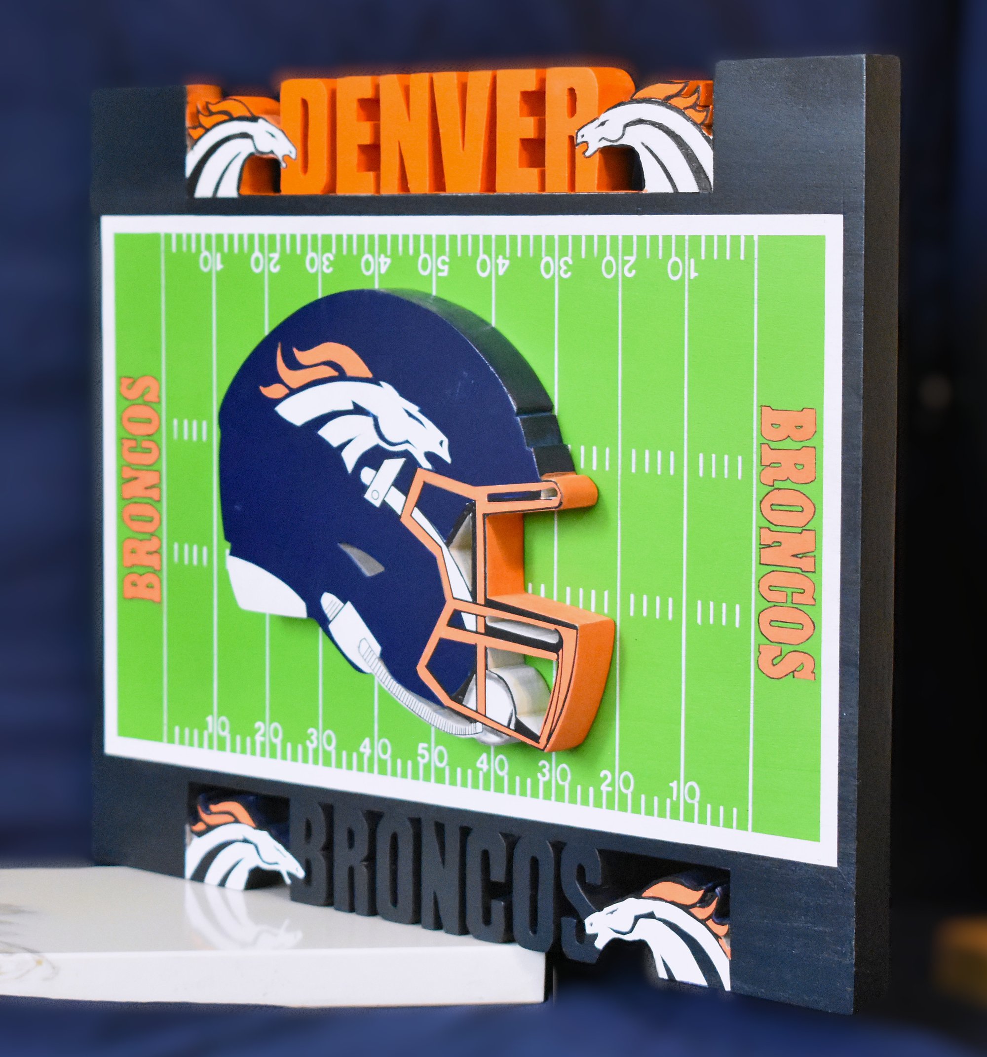 Denver Broncos Hand Crafted NFL 3D Wooden Team Helmet Wall Décor Hanging Artwork.